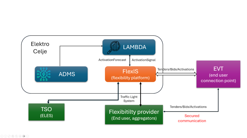 Close integration with Elektro Celje’s big data platform called LAMBDA will enable near real-time monitoring of transformer substation loading and network element conditions. Based on this information, Flexis will trigger flexibility activations manually or automatically, engaging different sources depending on network needs, from reducing EV charging to adjusting heat pump operation or limiting PV generation output.